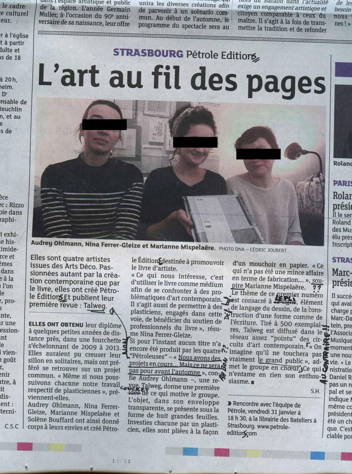 ____ table à MAD#3 - Multiple Art Days [Paris] >26 au 28/05/17 ____ création de la carte de vœux de la HEAR - Haute École des Arts du Rhin [Strasbourg] >janvier 17 ____ table à L'AUTRE SALON - salon de la microédition [Colmar] >26 au 27/11/16 ____ rencontre à la librairie du Magasin-CNAC [Grenoble] >26/11/16 ____ table à MISE EN PLI - Salon de la microédition [Marseille] >8 au 9/10/16 ____ table à MAD#2 - Multiple Art Days [Paris] >30/09 au 2/10/16 ____ participation à la BIBLIOTHEQUE LOCALE [Rennes] >11 au 12/06/16 ____ journée de soutien au Festival OFF D'ANGOULÊME [Paris] >10/01/16 ____ rencontre autour des éditions avec les étudiants, École Supérieure d’Art de Lorraine [Metz] >04/11/15 ____ intervention en conférence au FESTIVAL DE LA REVUE [Lyon] >06/06/15 ____ table à la foire d’art contemporain POPPOSITION [Bruxelles] >23 au 26/04/15 ____ tables rondes à la LIBRAIRIE SÉRIES GRAPHIQUES [Strasbourg] >13/03/15 FOCUS SUR LA COULÉE DOUCE D'UNE MARÉE NOIRE >14/03/15 PEUPLER DE STATIONS LES HORIZONS >15/03/15 PUITS D'ENCRE SUR PAPIER ____ table au Festival CENTRAL VAPEUR [Strasbourg] >12 au 14/12/14 ____ rencontre à l'INSTITUT FRANCAIS [Stuttgart] >11/10/14 ____ installation dans la vitrine de la Communauté Urbaine de Strasbourg >juillet à décembre 14 ____ participation aux ATELIERS OUVERTS [Strasbourg] >17,18,24,25/05/14 ____ rencontre à la bibliothèque de la HEAR [Strasbourg] >16/04/14 ____ rencontre à la LIBRAIRIE DES BATELIERS [Strasbourg] >31/01/14 ____ table au Festival CENTRAL VAPEUR [Strasbourg] >06 au 08/12/13